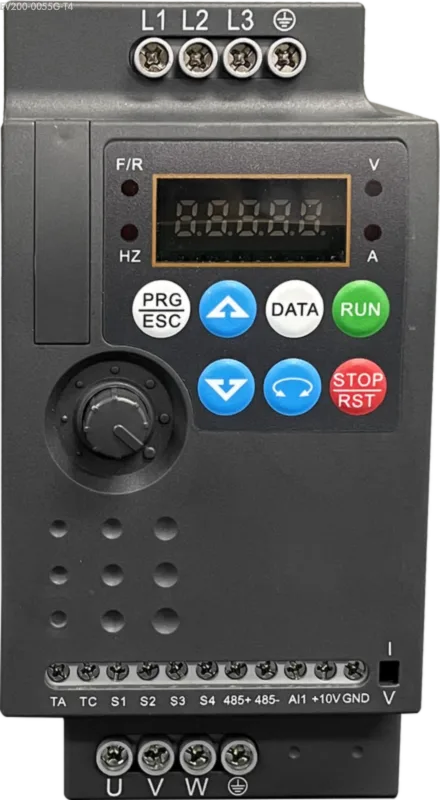 EV200 series high-performance VFD is the company’s new generation of high quality and high reliability small VFD drives (Inverter). Based on the market demand of small power, small volume and simple speed regulation, the Single Phase 220V AC and Three Phase 380V AC small VFD are targeted. The model EV200-005G-T4 specifically delivers 5.5kW power with 380V Three Phase input (14.6A) and 13.0A output current (8.9kVA capacity), perfectly suited for applications like Industrial Pumps, Heavy-Duty Conveyors, etc.